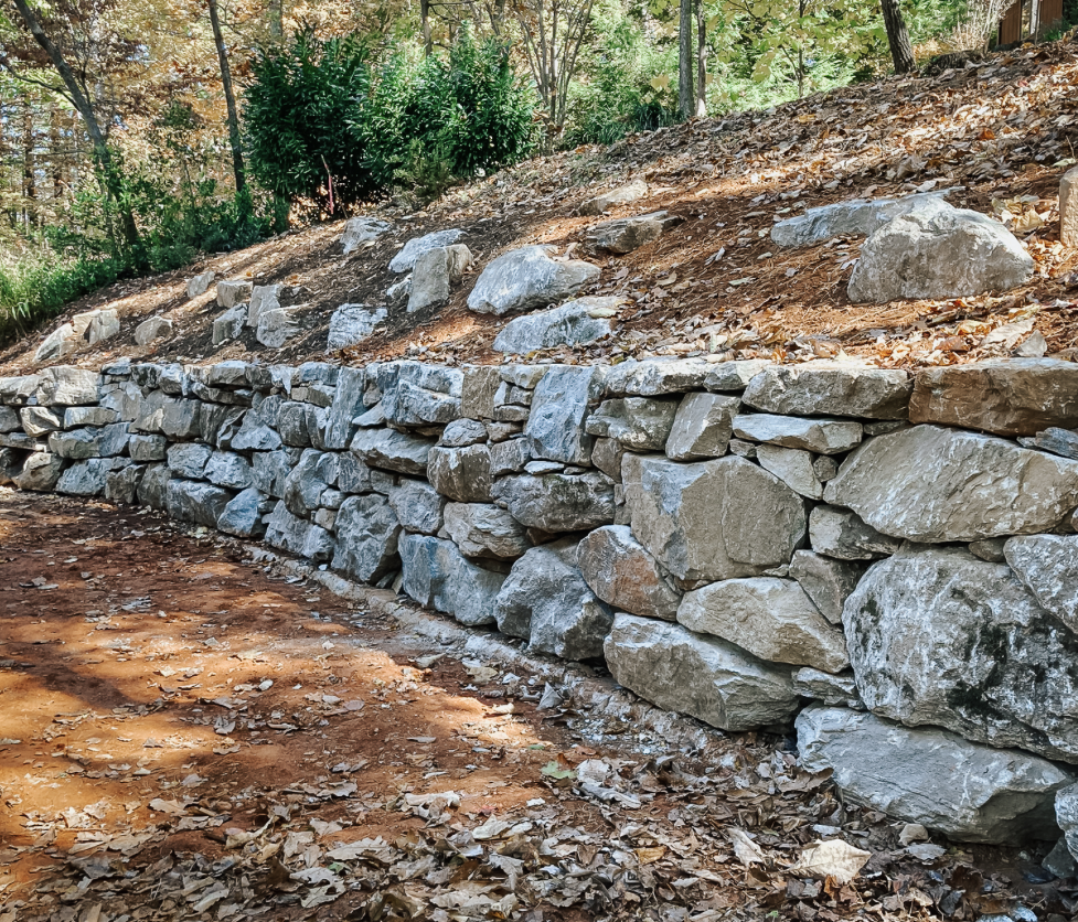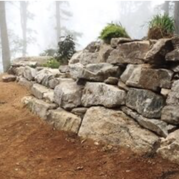 In addition to our masonry walls, patios, and walkways, we construct rock gardens, dry streambeds, boulder walls, and sculptural boulder placements. We have access to local boulders and heavy equipment, and boulder walls can be more cost-effective than stacked stone walls.